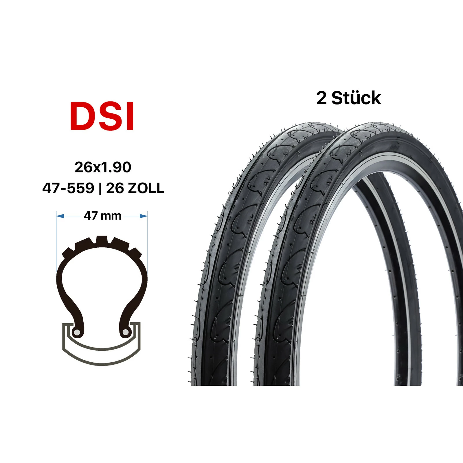 2 Stück 26 Zoll DSI Fahrrad Reifen 47-559 City Bike Stadtrad 26×1.90 Schwarz