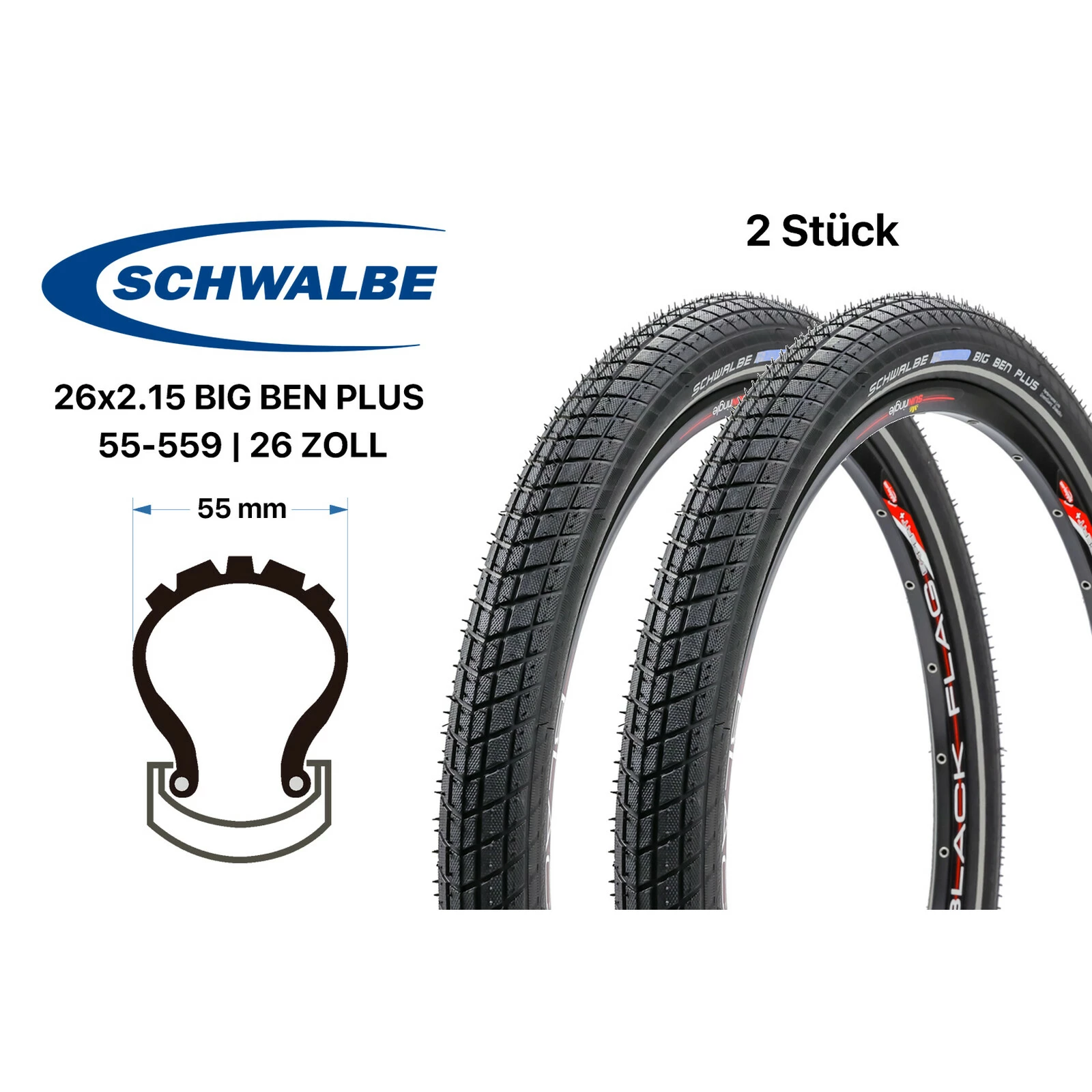 2 Stück 26 Zoll Schwalbe Big Ben Plus Reifen 26×2.15 City Bike Reflex Streifen