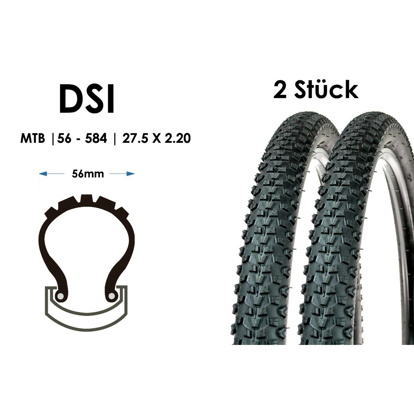2 Stück 27.5 Zoll Fahrrad Reifen DSI 56-584 MTB Tire 27.5×2.20 Mantel Decke Schwarz