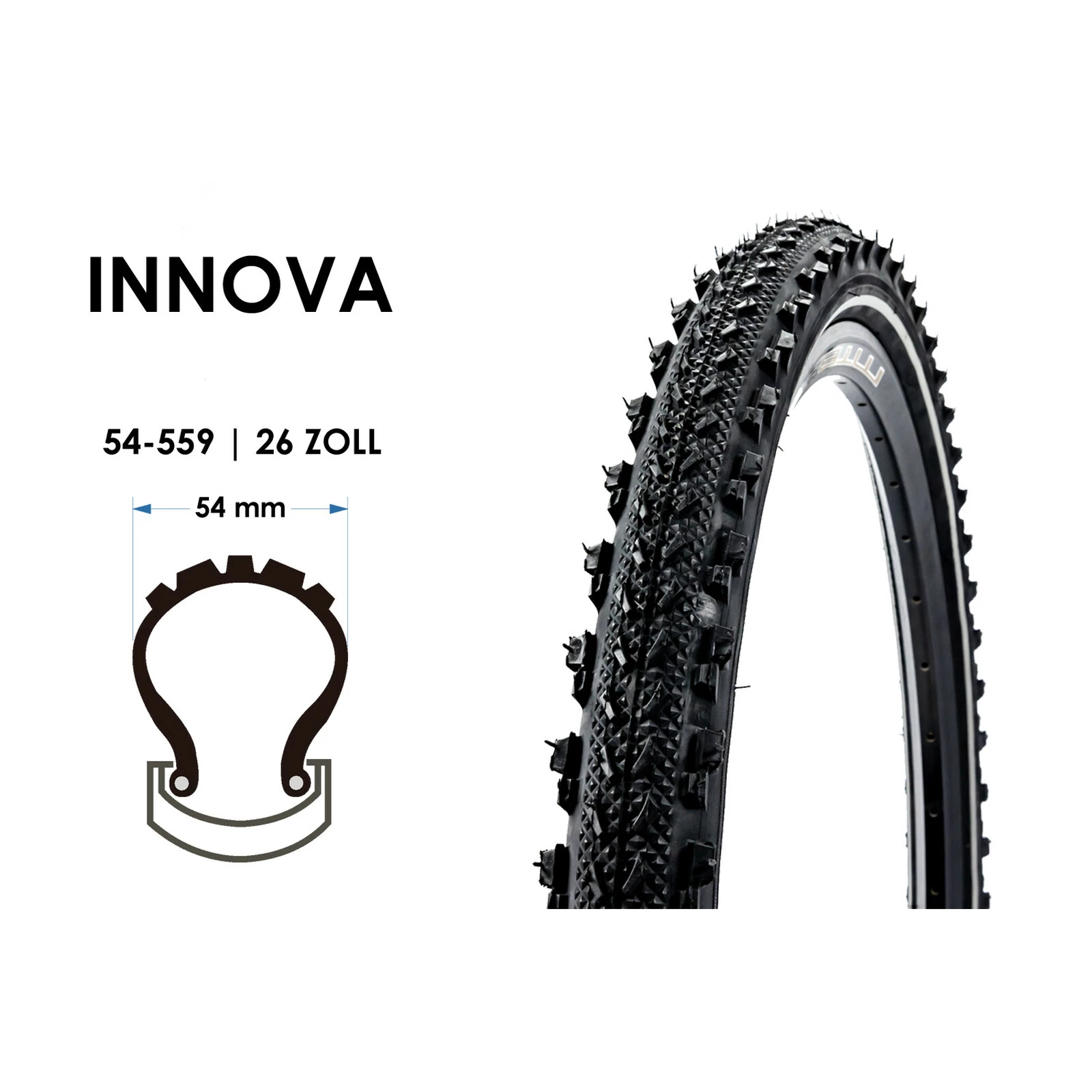 Innova Fahrrad Reifen Einsatzzweck: Mountain Bike Laufradgröße: 26×2 00 Zoll Reifengröße ETRTO in mm (Breite x Durchmesser): 54-559 Bauart: Drahtreifen max