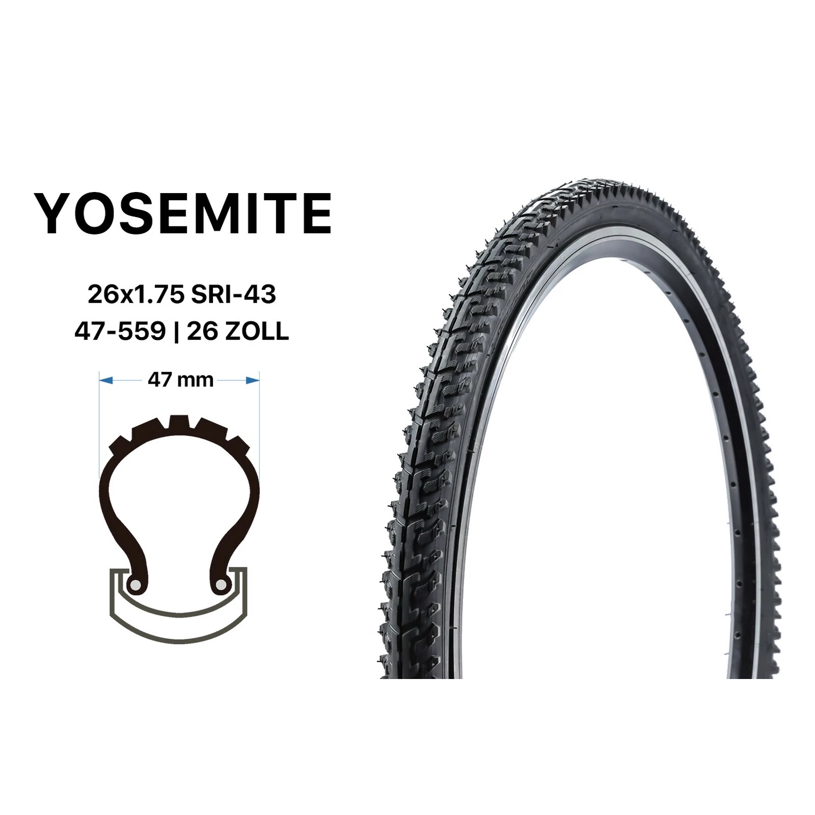 26 Zoll YOSEMITE Fahrrad Reifen MTB Trekking 26×1.75 Mantel Decke 47-559 Schwarz