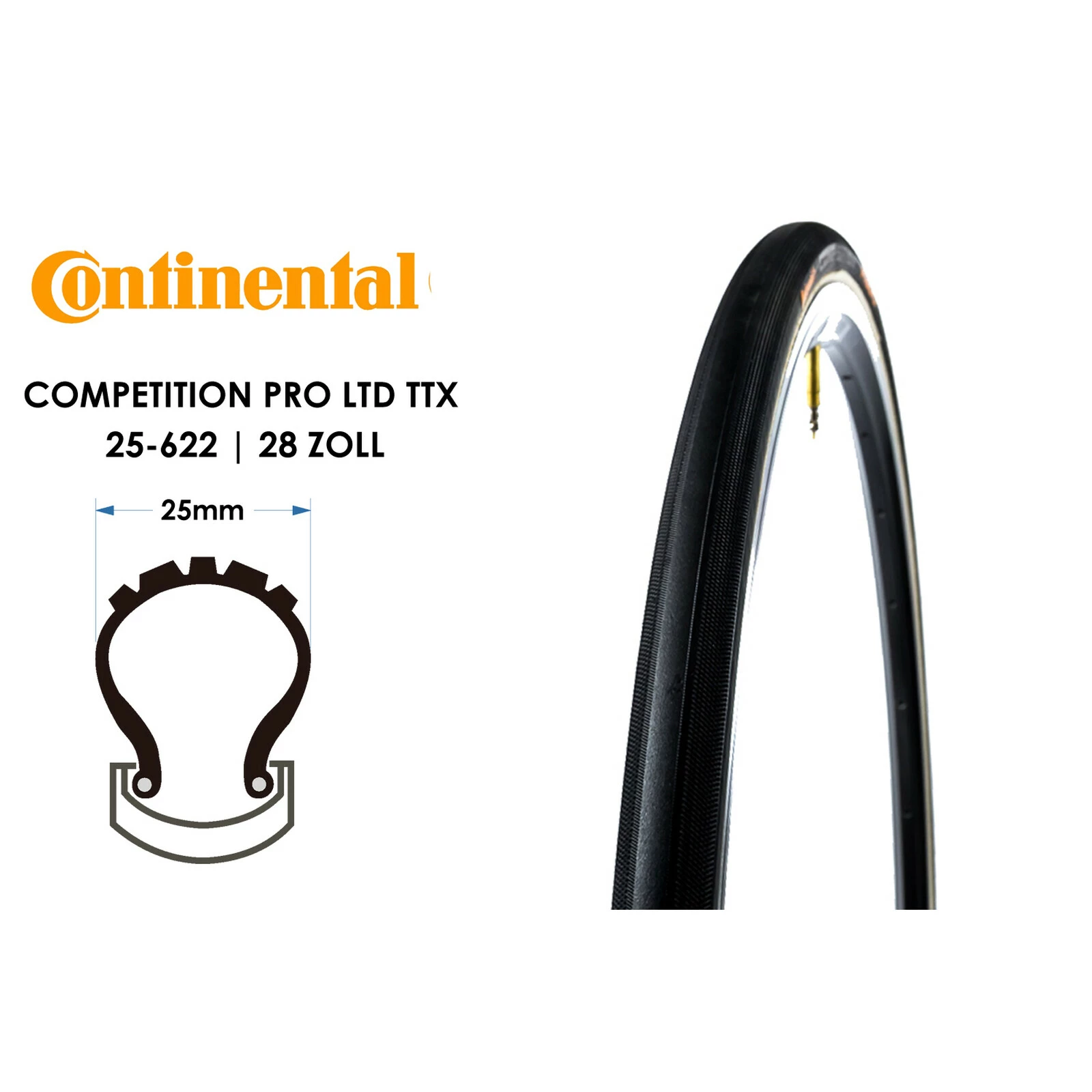 Marke: Continental Modell: Competition Pro LTD TTX Reifentyp: Schlauchreifen für Einzelzeitrennen (Time Trials) Laufradgröße: 28 Zoll ETRTO: 25-622 (Breite-