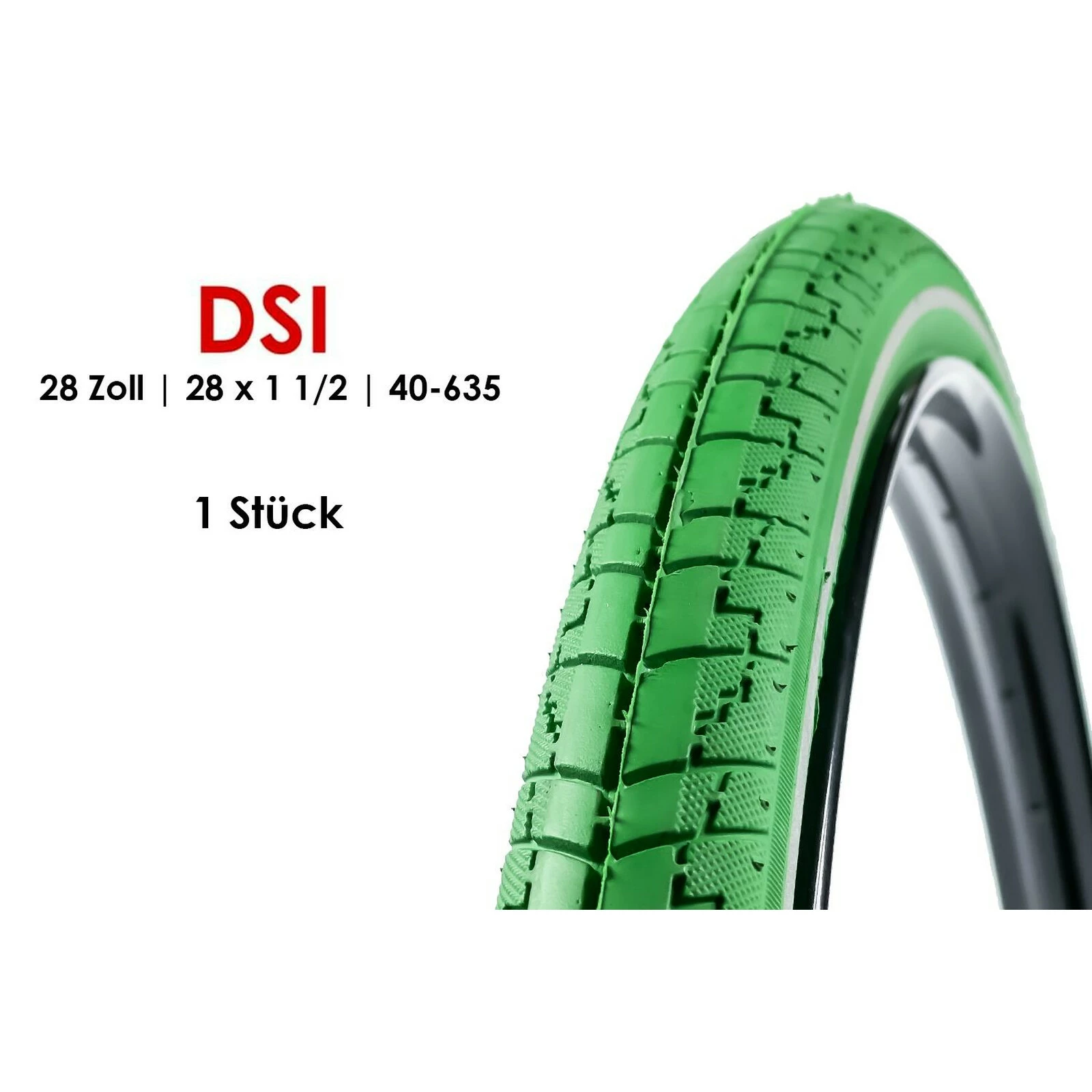 Marke: DSI Laufradgrösse : 28 Zoll Reifentyp: Drahtreifen für Hollandräder, Citybikes Grösse: 28 x 1 1/2 ETRTO: 40-635 Farbe: Grün mit Reflexstreifen Dutch