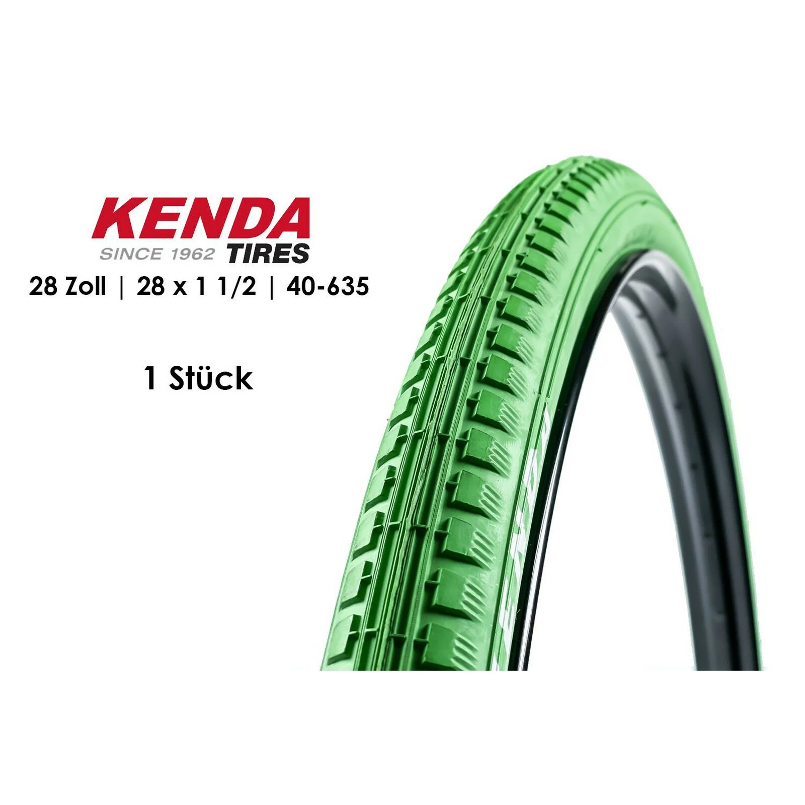 Marke: KENDA Laufradgrösse : 28 Zoll Reifentyp: Drahtreifen für Hollandräder, Citybikes Grösse: 28 x 1 1/2 ETRTO: 40-635 Farbe: Grün Hierbei handelt es sich