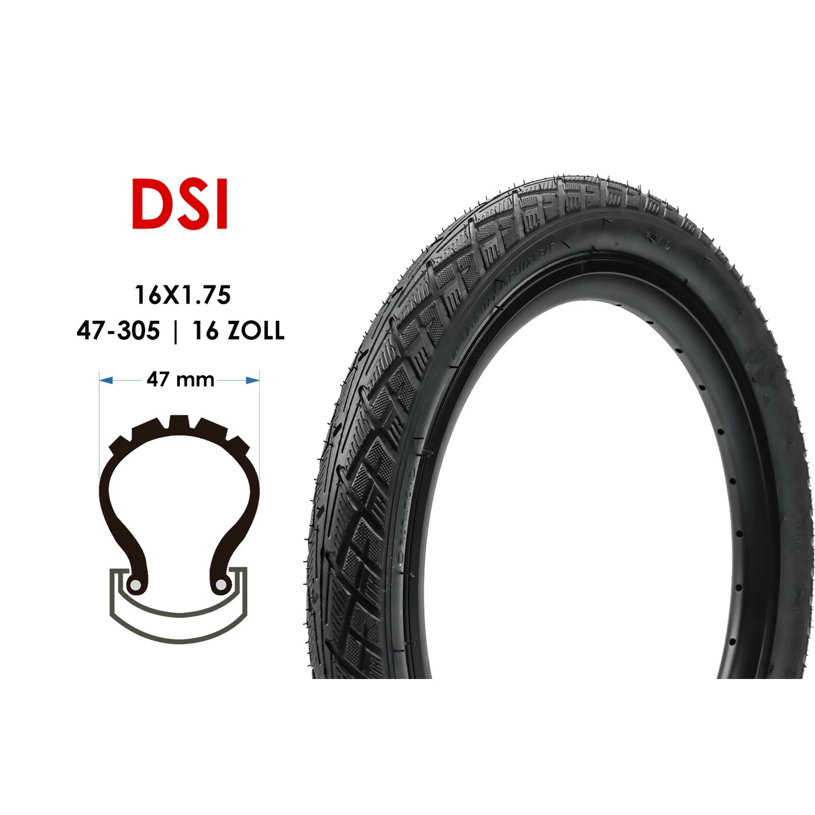 DSI 16 Zoll Fahrrad Reifen 16×1.75 Kinder Laufrad Kinderwagen 47-305 Schwarz