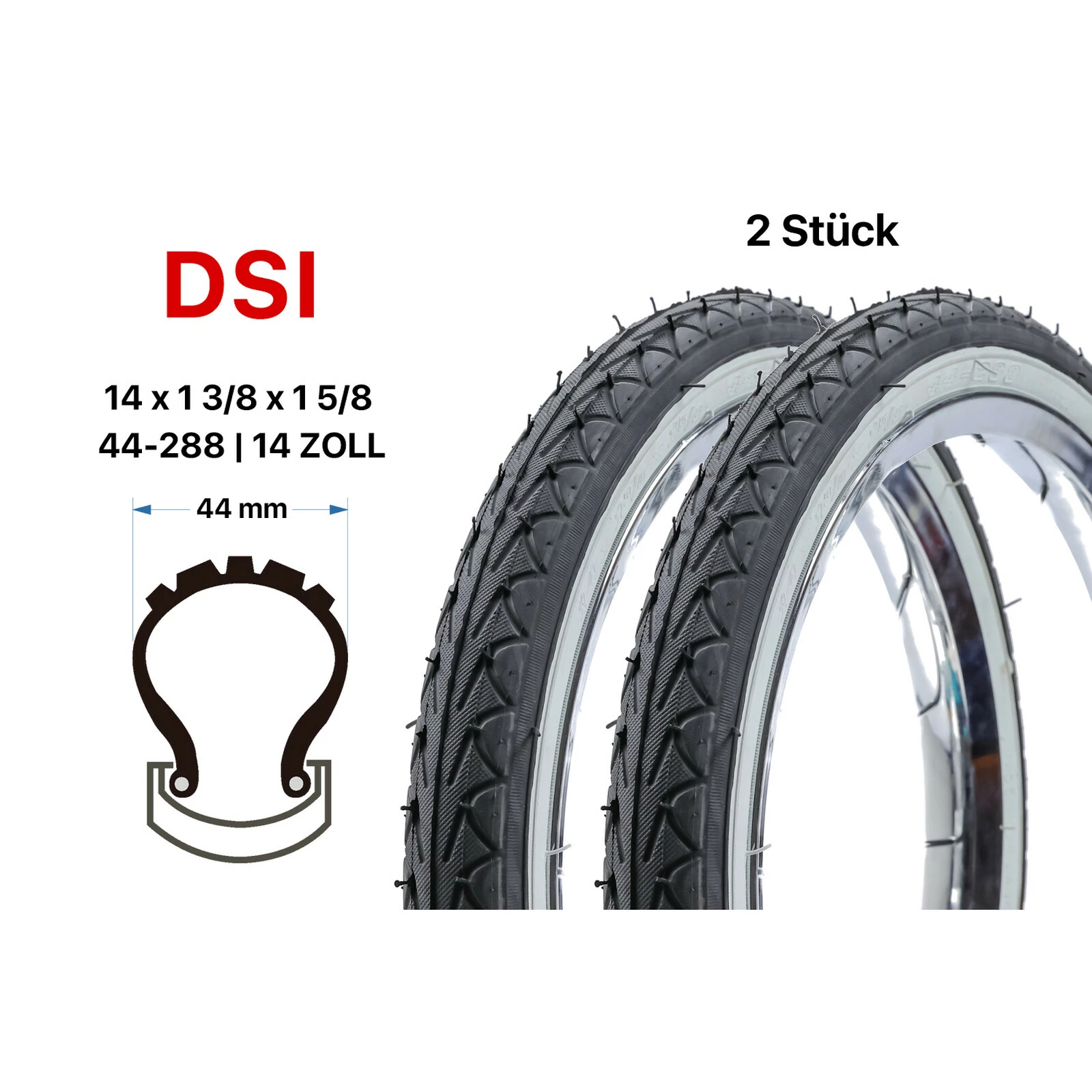 DSI 2 Stück 14 Zoll Fahrrad Reifen 14×1 3/8 Kinderrad 44-288 City Bike Tire Schwarz Weisswand