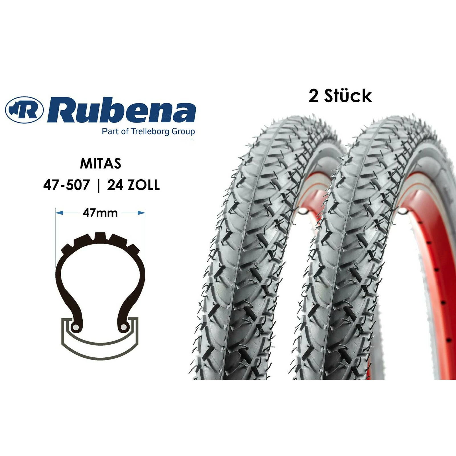 Rubena 2 Stück 24 Zoll Fahrrad Reifen MITAS 24×1.75 Tourenräder Citybikes 47-507 Grau